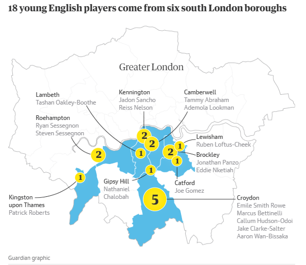 The likes of Jadon Sancho, Tammy Abraham, Joe Gomez, Aaron Wan-Bissaka, Callum Hudson-Odoi, Ryan Sessegnon, Reiss Nelson and Ademola Lookman are all South Londoners.